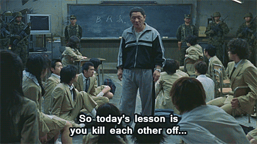 Εδώ οι Fukasaku και Kitano γραπώνουν βίαια ένα σύμβολο της γνώσης , της μετάδοσης της και της προετοιμασίας των νέων για το ‘αύριο‘ και το διαστρεβλώνουν σε κάτι το εξαιρετικά απρόσωπο , το σκληρό και απάνθρωπο…