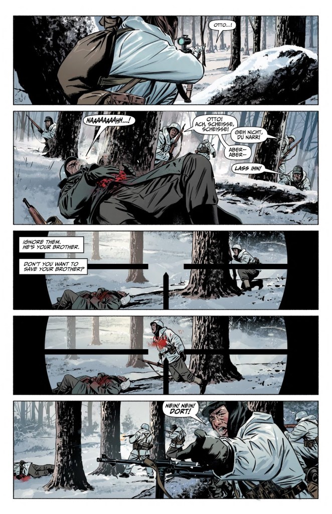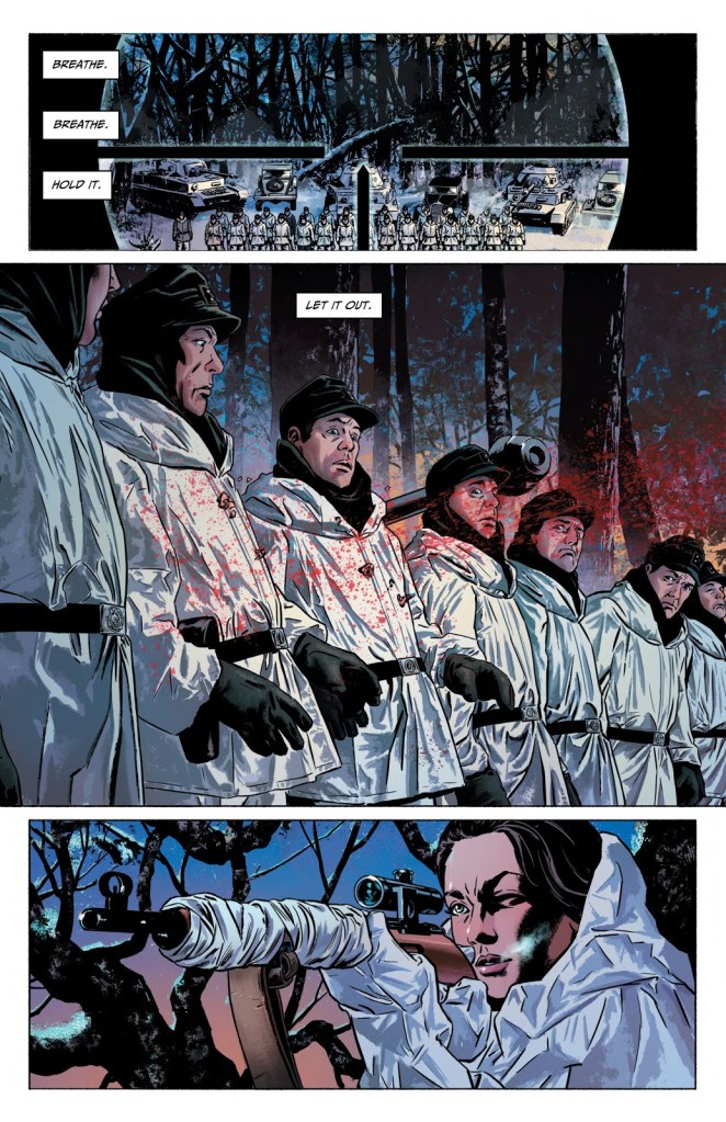Εδώ η σήμα κατατεθέν καφρίλα του συγγραφέα σχεδόν εξανεμίζεται και την θέση της παίρνουν ένας σκληρός ρεαλισμός , μια χειρουργική μεθοδικότητα και ένας στυγνός κυνισμός. Η ‘μετάλλαξη‘ αυτή του Ennis έχει θετικότατο και εξαιρετικά ουσιώδη αντίκτυπο τόσο επάνω στον τίτλο του όσο και επάνω στον ίδιο. Κακά τα ψέματα τα τελευταία χρόνια ο Garth Ennis είχε ‘βολευτεί‘ επάνω στα trademarks που θέσπισε, ή αναβάθμισε, ο ίδιος μέσα από τίτλους όπως το υπέροχα βλάσφημο PREACHER με αποτέλεσμα να μην δίνει ιδιαίτερη δεκάρα για την ανάπτυξη των ιστοριών και των χαρακτήρων που βλέπουμε στα τελευταία του comics. H επιλογή ενός πιο μετρημένου και σοβαρού ύφους αναδεικνύει την βαρύτητα μιας μυθοπλαστικής ιστορίας που όμως έχει στηριχθεί επάνω σε αληθινά γεγονότα της Ρωσικής Ιστορίας. Εδώ η Sara ουσιαστικά αποτελεί έναν κινούμενο και θλιμμένο φόρο τιμής στην Lyudmila Mikhailovna Pavlichenko την Σοβιετική Sniper που αφού καθάρισε γύρω στους 309 (επιβεβαιωμένους) στόχους και κέρδισε το παρατσούκλι / τίτλο ‘Λαίδη Θάνατος’ ,στην συνέχεια επιστρατεύτηκε από τον Κόκκινο Στρατό ως ένα ακόμη γρανάζι για την μηχανή της προπαγάνδας του.