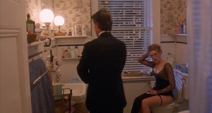 Η εικόνα μιας γυναίκας όπως είναι η Nicole Kidman να κάθεται στην τουαλέτα και να κατουράει μπροστά στον άντρα της είναι μια σκηνή που σχεδόν ποτέ σου δεν την πετυχαίνεις σε ταινίες του Hollywood. Διάολε είναι μια σκηνή που οι περισσότερες γυναίκες ,έξω στον αληθινό κόσμο και όχι επάνω στο κινηματογραφικό πανί, θα την ‘έκοβαν‘ με μια μανία που είναι ισάξια με ενός μοντέρ που του έχει δοθεί η εντολή να πετσοκόψει μια ‘ανάρμοστη‘ και ‘αντιαισθητική‘ σκηνή ! Η πλειοψηφία των γυναικών αποφεύγει να χρησιμοποιεί την τουαλέτα μπροστά στους άντρες ή τους γκόμενους όχι μόνο για λόγους ευγένειας αλλά επειδή φοβούνται ότι αυτή η καθημερινή και οικιακή εικόνα θα χαλάσει την γοητευτική και σέξι βιτρίνα που μας έχουν μοστράρει με τόσο μεγάλη προσήλωση. Βλέποντας την Alice Harford να κατουράει υπό το βλέμμα του συζύγου της στο υποσυνείδητο σου αρχίζει κατευθείαν να σχηματίζεται η σκέψη ότι εδώ έχουμε να κάνουμε με ένα ζευγάρι που έχει αρχίσει να φθείρεται από την γαμήλια και την οικογενειακή ρουτίνα σε τόσο μεγάλο βαθμό που πλέον κανένα από τα δυο μέλη δεν νοιάζεται ιδιαίτερα ώστε να διατηρήσει μια αίσθηση ρομαντισμού και γοητείας.
