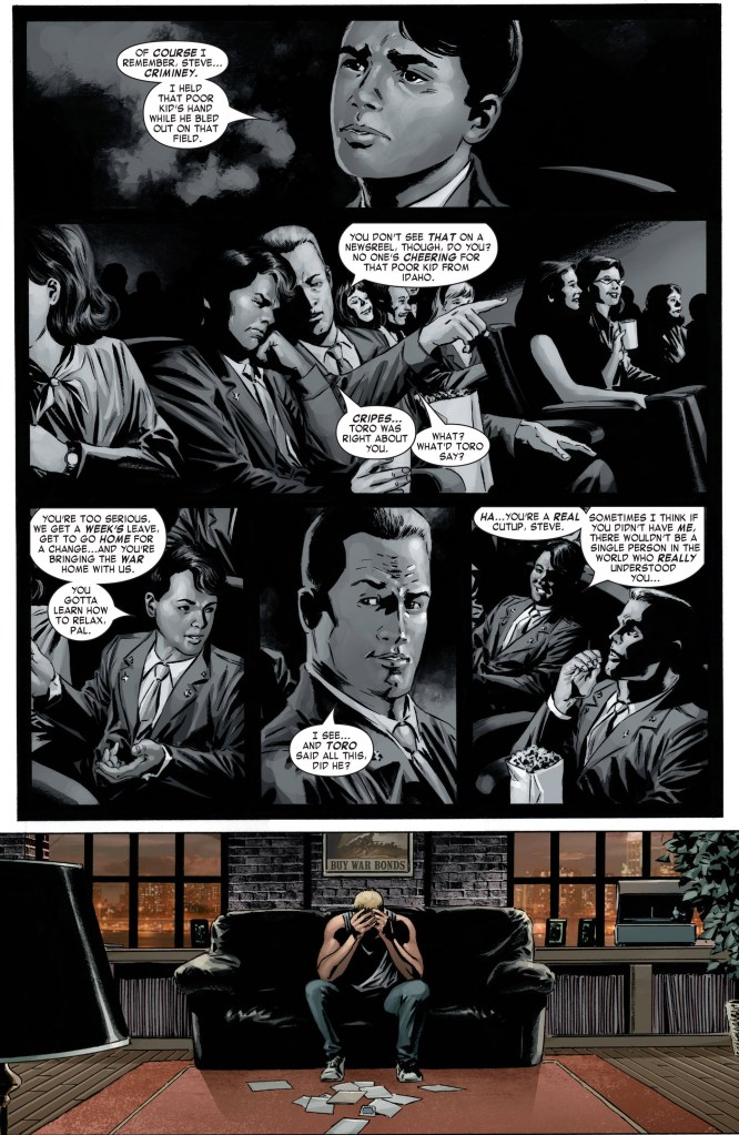 Ο Brubaker δεν μας δείχνει μονάχα τις επιπτώσεις που έχει η ‘ανάσταση‘ του Bucky Barnes απέναντι στον Steve Rogers αλλά στο ενδιάμεσο μελετά και το μετατραυματικό σύνδρομο που αποκόμισε ο πρώτος ύστερα από όλη την φρίκη που βίωσε καθώς αντιμετώπιζε τους Ναζί και τα ανίερα δημιουργήματα του μοχθηρού Red Skull πίσω στο μέτωπο…