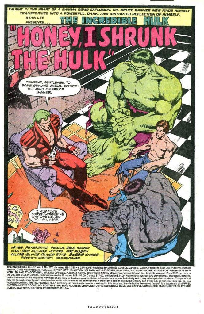 Επιστρατεύοντας , τον πλέον αρκετά cult, Doc Samson ο συγγραφέας παίρνει ο ίδιος τον ρόλο του ψυχαναλυτή που θα εξηγήσει τόσο στον ασθενή όσο και σε εμάς τους αναγνώστες την καταπιεσμένη αλήθεια πίσω από τις διάφορες μεταμορφώσεις του Banner.