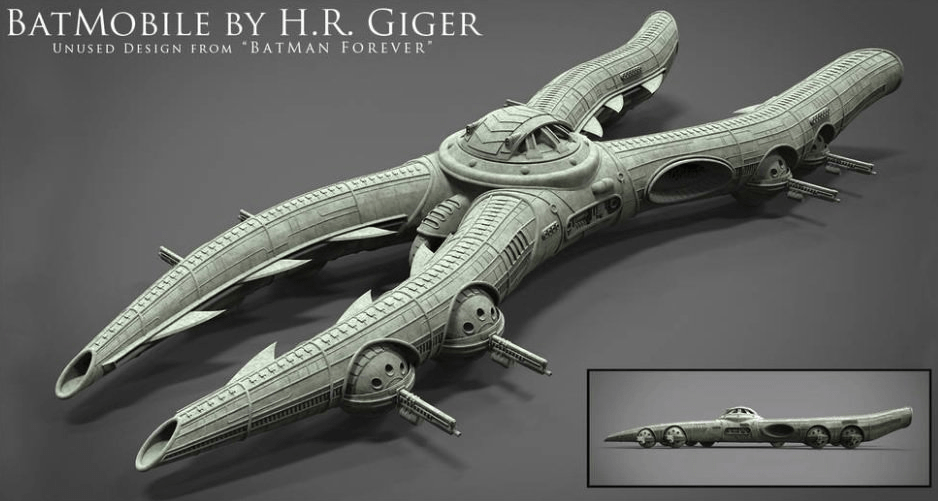 Λογικά ο σπουδαίος και περίφημος καλλιτέχνης H.R.Giger παραήταν ‘Edgy‘ για τα γούστα της Warner Bros και έτσι το σουρεαλιστικό Batmobile που σχεδίασε για λογαριασμό τους κατέληξε να χαθεί μέσα σε κάποιο αρχείο …