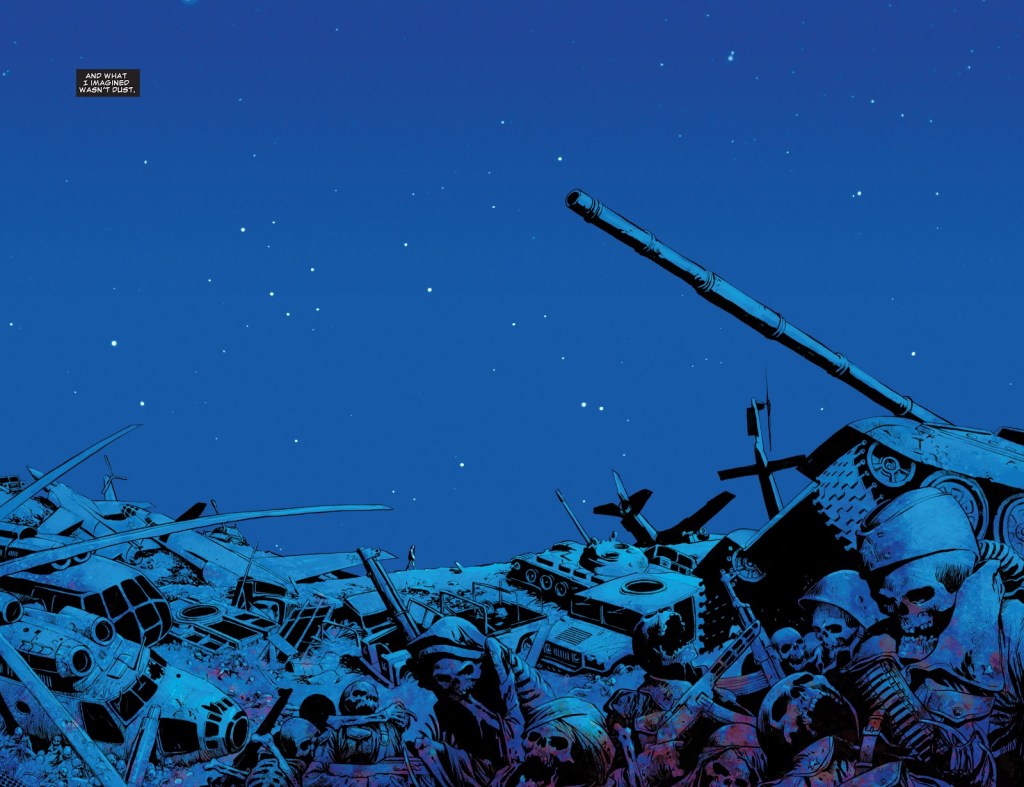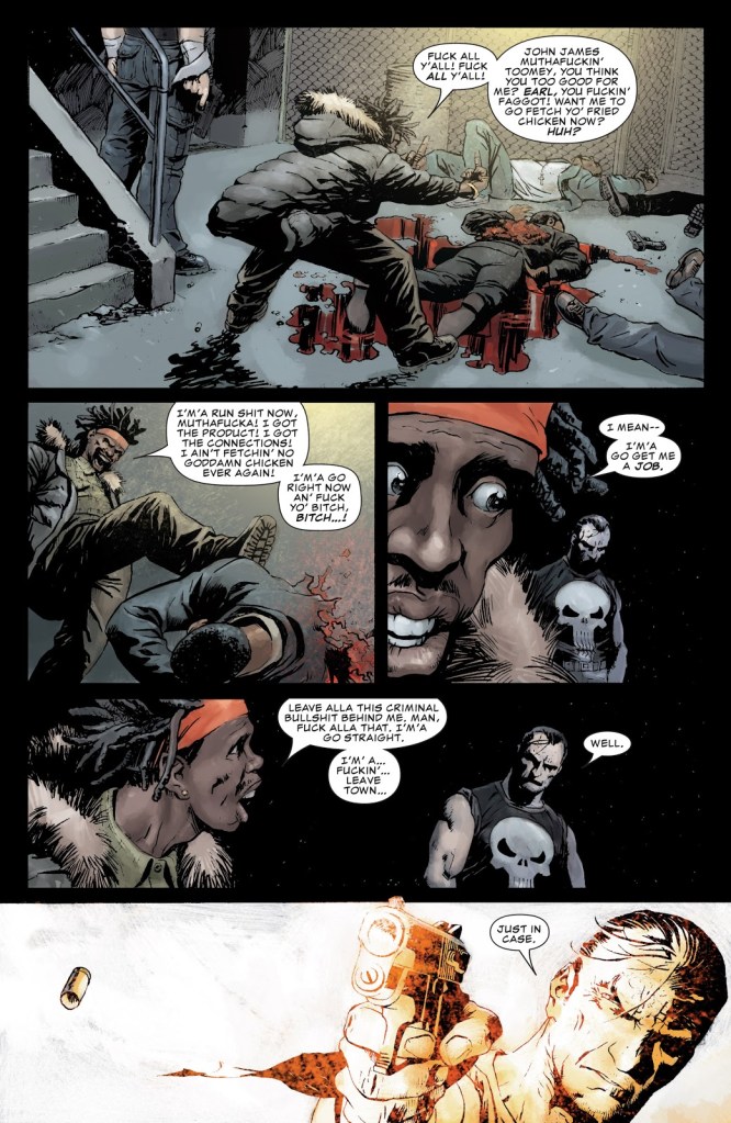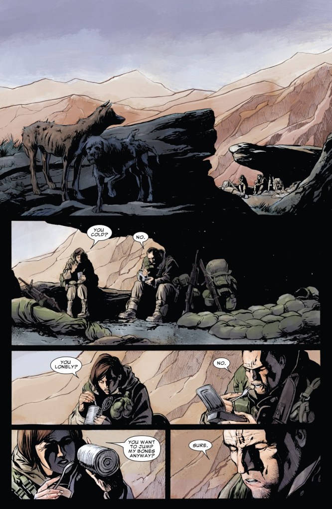 Αλλά ο Ennis ποτέ του δεν λειτουργούσε μονόπλευρα στις πολεμικές και ιστορικές του εξιστορήσεις. Δεν ντύνει τον Frank Castle σαν έναν ‘Ράμπο ΙΙΙ’ που θα λειτουργεί σαν γραφική ψυχαγωγία και ίσως σαν μια μορφή κακής προπαγάνδας.