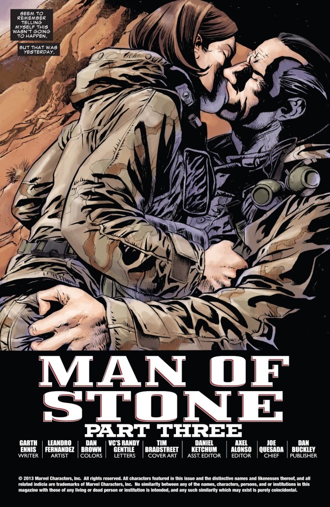 Στο ‘Man of Stone’ ο Ennis μας αποκαλύπτει περισσότερες λεπτομέρειες γύρω από το παρελθόν των O’Brien , Rawlins και Zakharov αλλά και τις φριχτές λεπτομέρειες που τους συνδέουν με το Αφγανιστάν. Η πρώτη εκπροσωπεί όλους εκείνους που εγκαταλείφθηκαν από τις πατρίδες τους και έμειναν πίσω να βασανίζονται και να υποφέρουν ενώ ο δεύτερος είναι η απόλυτη απεικόνιση αυτής της στυγερής προδοσίας.