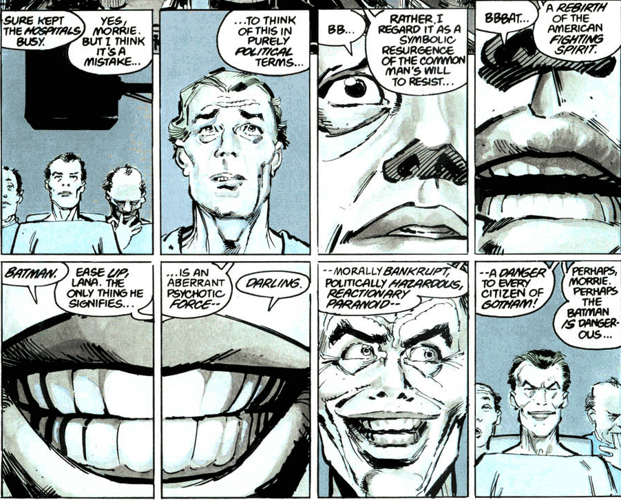 Μέσα από τις σελίδες του THE DARK KNIGHT… o Miller μας παρουσιάζει την πιο σύνθετη αλλά και ωμή και βίαιη αναμέτρηση ανάμεσα στους ίσως μεγαλύτερους και πιο αναγνωρίσιμους ανταγωνιστές στην ιστορία των comics. Και σε αυτή την αναμέτρηση δεν υπάρχει κανένας νικητής. Στο τέλος τόσο ο Batman όσο και ο Joker φαντάζουν ηττημένοι. Απλά ο δεύτερος κράτησε το τελευταίο ‘HAHA‘ για λογαριασμό του.
