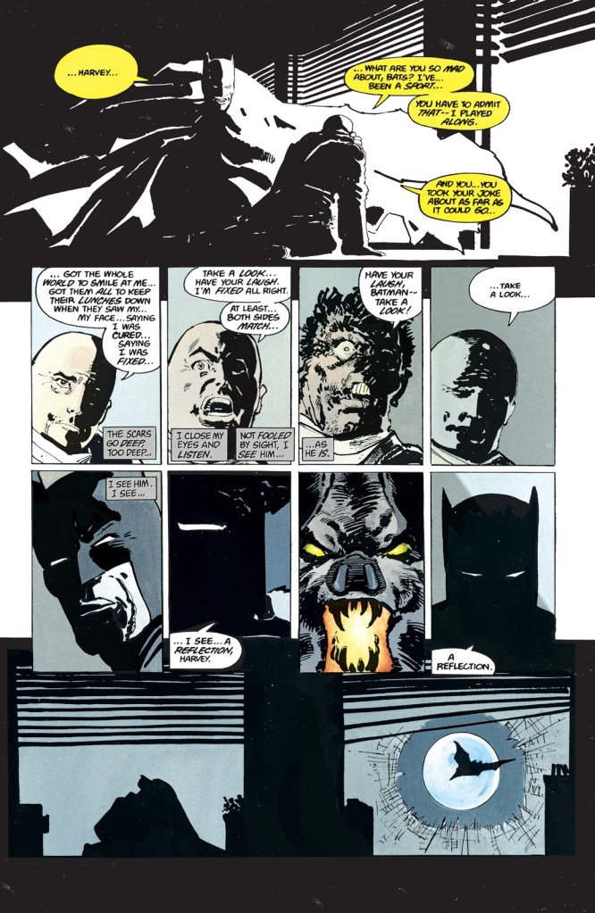 Καθώς ο νικημένος εγκληματίας προτρέπει τον εχθρό του να τον κοιτάξει κατάμουτρα και να χλευάσει ο Batman διακρίνει πίσω από το αποκατεστημένο πρόσωπο ενός κάποτε ανιδιοτελή και τίμιου εισαγγελέα τις χειρότερες πτυχές του υποσυνείδητου του. Και δεν ‘γελά‘ καθόλου καθώς για μια φευγαλέα στιγμή το ‘μοναδικό‘ πρόσωπο που απέμεινε πραγματικά στον Harvey Dent κάνει την εμφάνιση του μόνο και μόνο ώστε ο ήρωας να διακρίνει επάνω σε αυτό την αντανάκλαση μιας…νυχτερίδας...