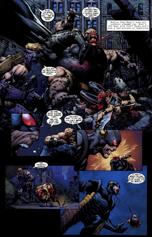 Η σεκάνς της κακοποίησης της Wasp από τον άντρα της πραγματικά ζεχνει από 00s ακρότητα. Είναι τρομαχτική αλλά και ταυτόχρονα κάπως γελοία μέσα από την υπερβολή της. Μια υπερβολή που ο Millar ξεκάθαρα την επιστρατεύει απλά για να προκαλέσει συναισθηματικά τους αναγνώστες του. Όμως από την άλλη πόσες και πόσες φορές δεν έχουμε δει στην τηλεόραση ή διαβάσει σε sites και εφημερίδες αληθινά περιστατικά κακοποίησης που είναι τόσο φριχτά που κάνουν την λέξη “υπερβολική ” να φαντάζει λίγη? Μπορεί ένα περιστατικό ενδοοικογενειακης βίας να φαντάζει ποτέ του “υπερβολικό“?