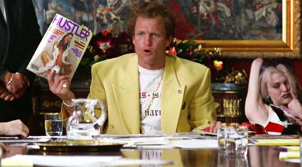 Ντυμένος με κοστούμι και με μια γραβάτα που φέρει επάνω της την Αμερικανική σημαία ο Flynt μιλάει με τόσο πάθος που φαντάζει λες και είναι ένας “πλανητάρχης” (ή ευαγγελιστης) της πορνογραφίας!