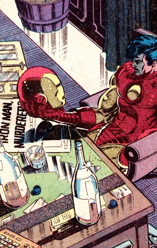 Ένας εκκεντρικός και Playboy εκατομμυριουχος που πίνει μερικά μαρτίνι παραπάνω καθώς ταξιδεύει first class δεν είναι μια αφύσικη εικόνα. Όμως εδώ είναι που ο Michelinie αρχίζει να μας αποκαλύπτει ότι το αλκοόλ παίζει σε καθημερινή βάση μέσα στην ρουτίνα ενός άντρα που πιέζεται από μια διττή ζωή.