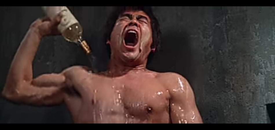 … με τον πιο macho τρόπο που θα δεις ποτέ σου κάποιον να τρώει μια μπανάνα, στην συνέχεια “γιατρεύει” τα τραύματα του κάνοντας ντουζ με… ένα μπουκάλι ουίσκι και το οποίο φυσικά το άνοιξε με τα δόντια του!